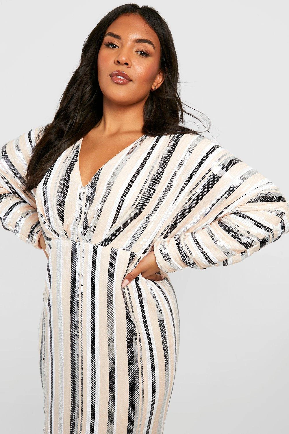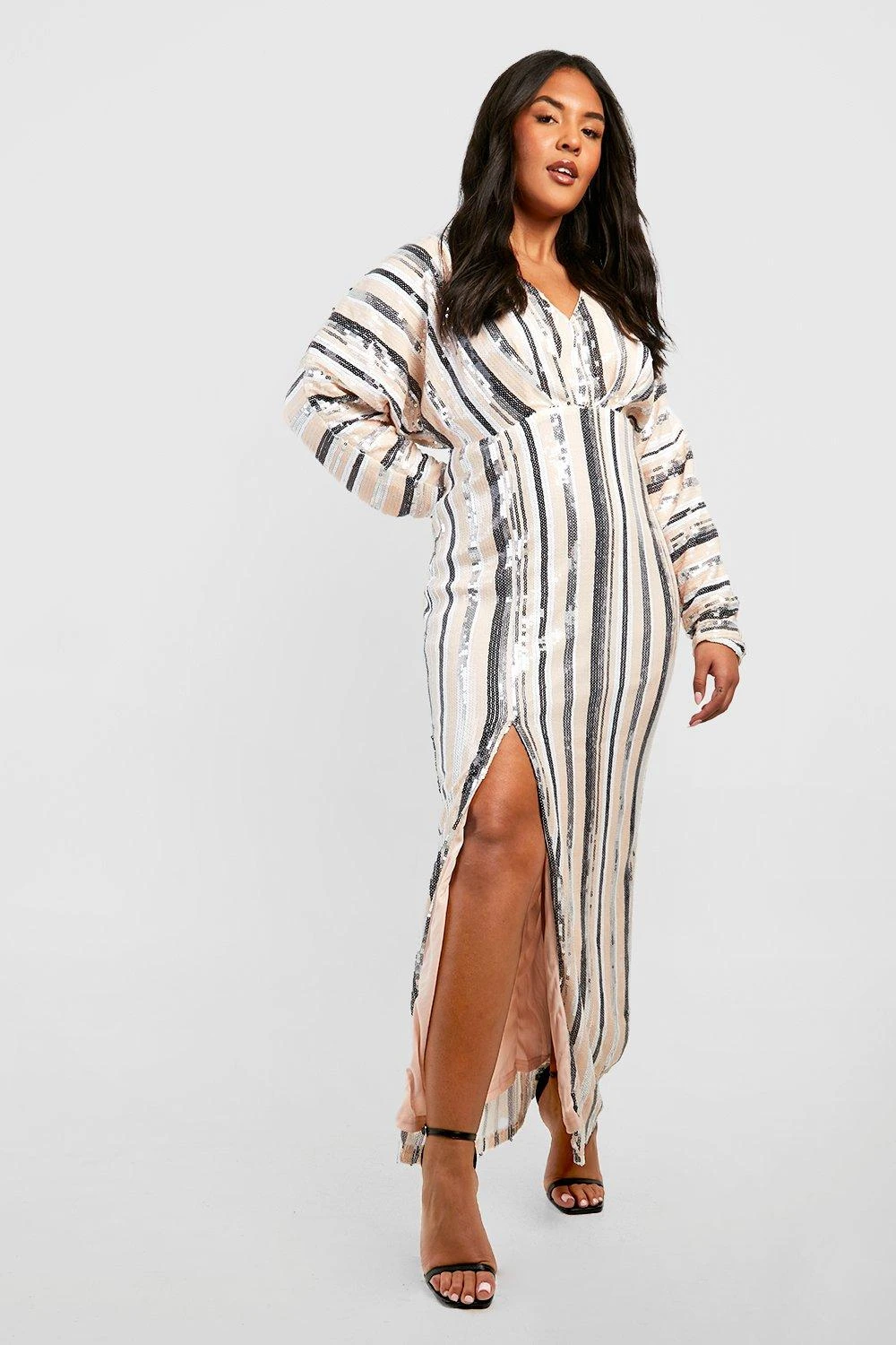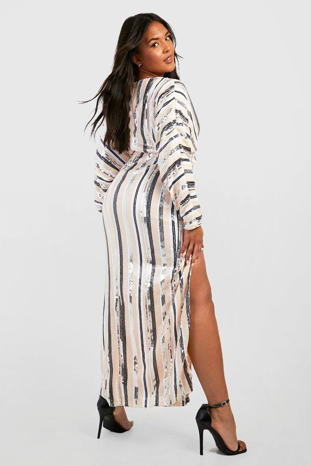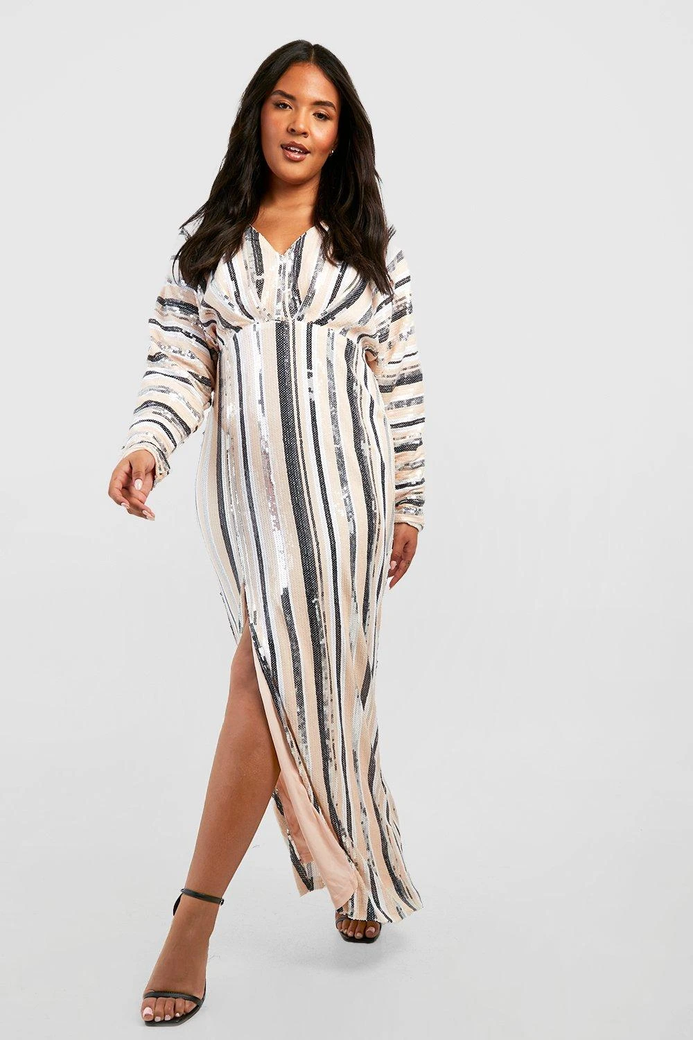 Grande taille – Robe longue fendue pailletée à rayures